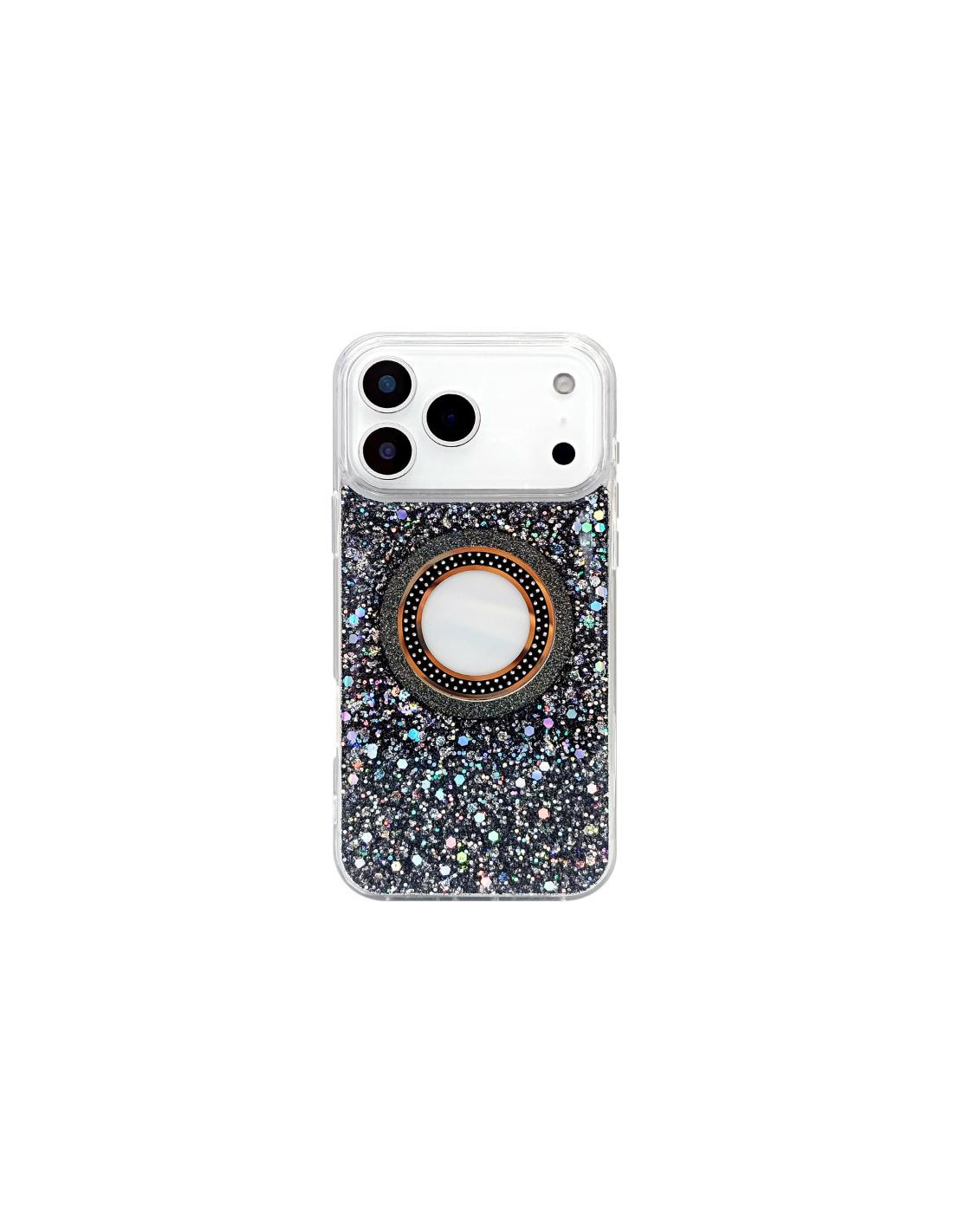 Cover iPhone 17 Pro in TPU con design glitterato specchio e strass. Compatibile con MagSafe, protezione elegante e brillante.