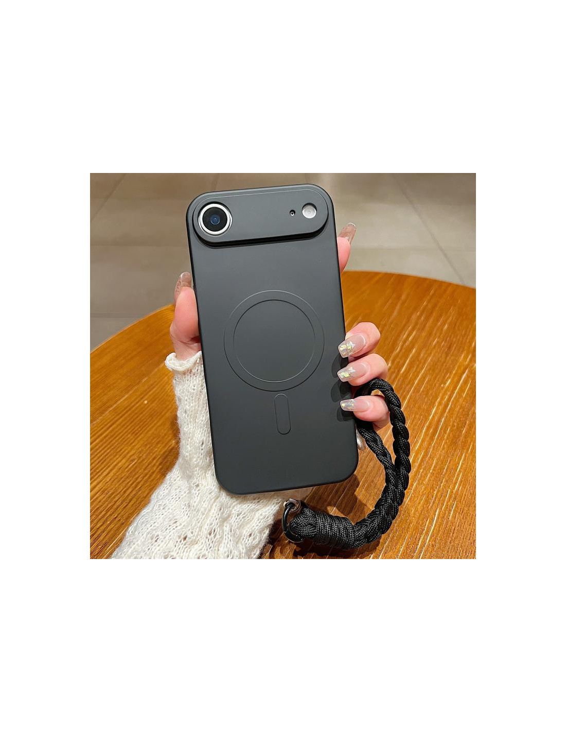 Cover iPhone Air in silicone liquido nero con cordino magnetico. Protezione morbida e pratica per il tuo smartphone.