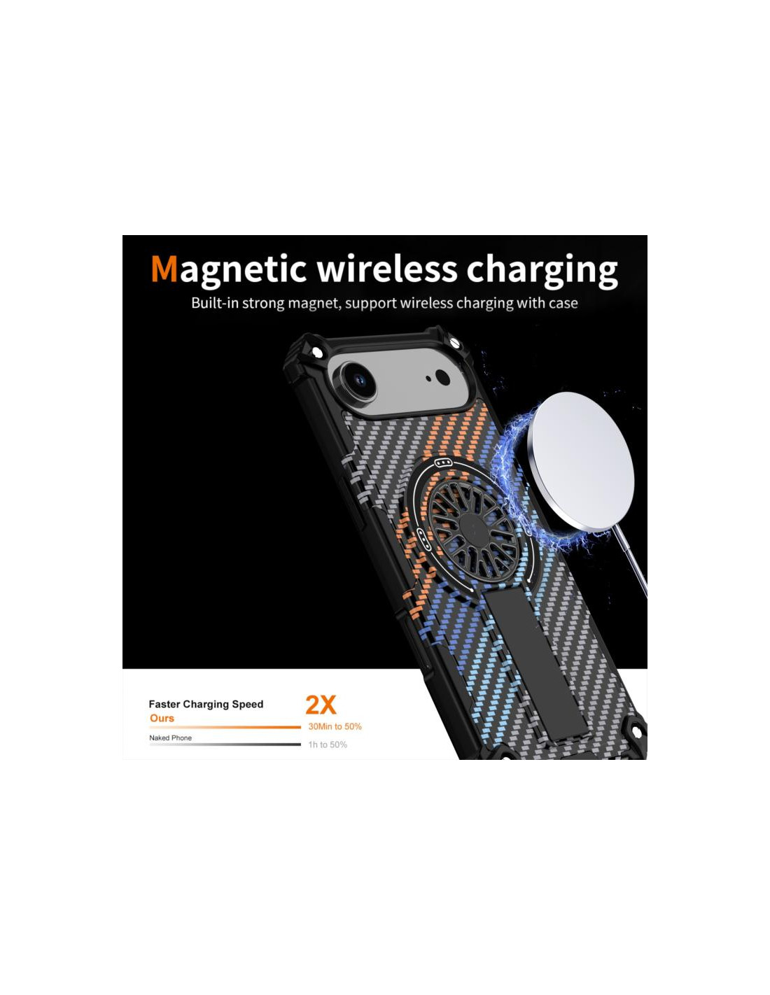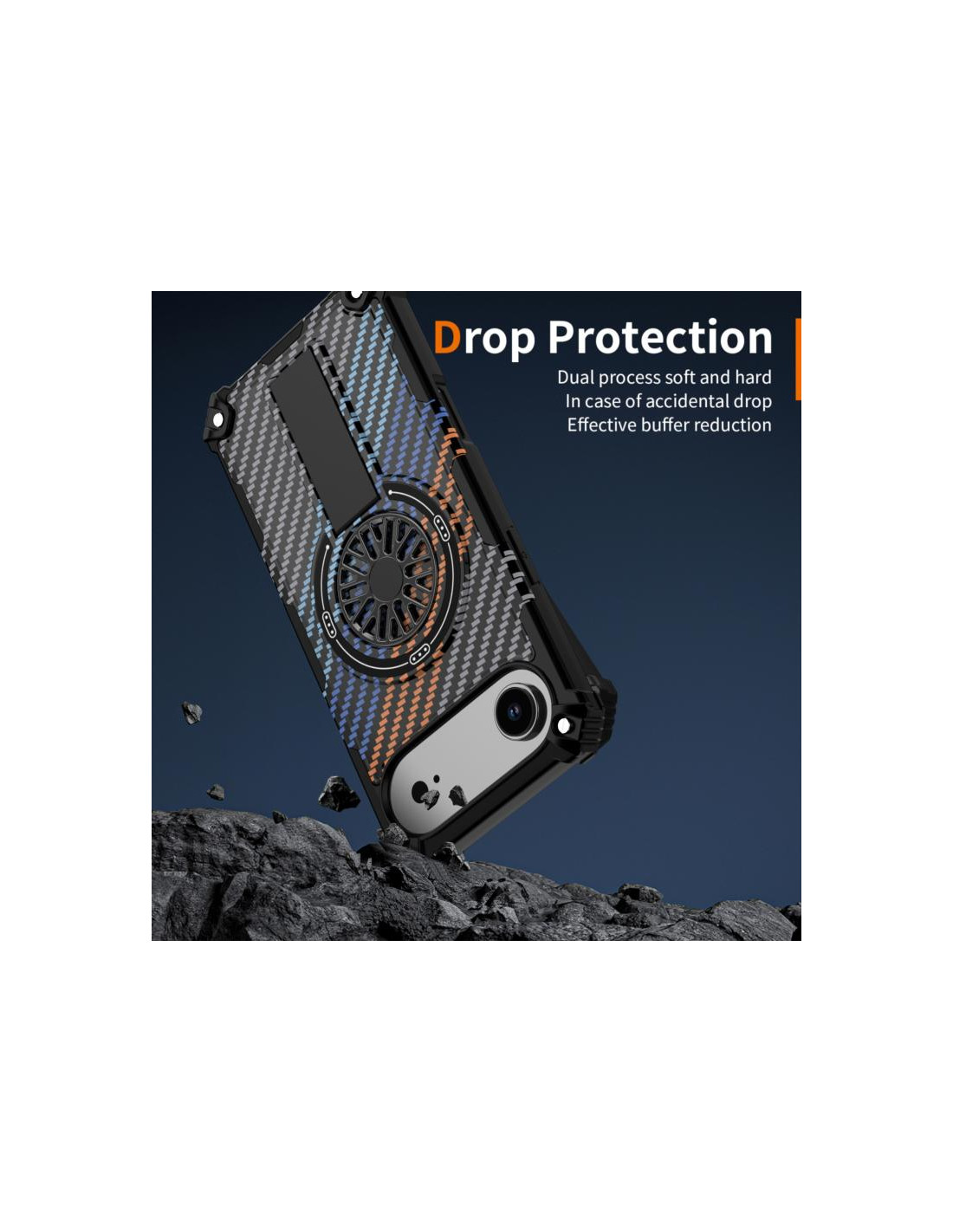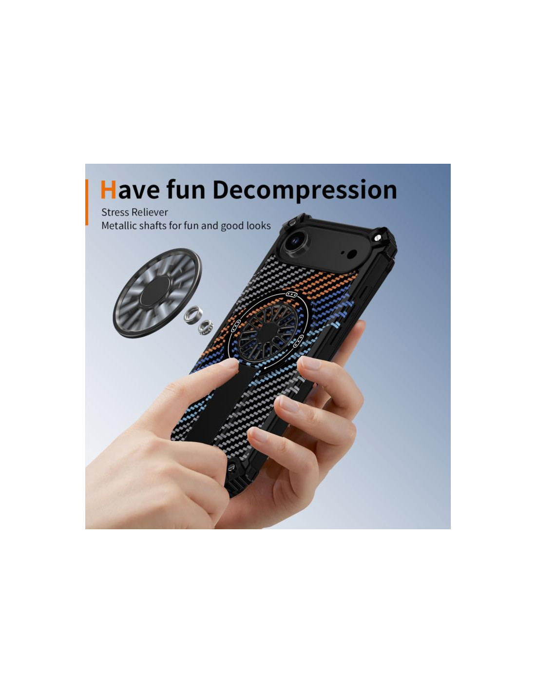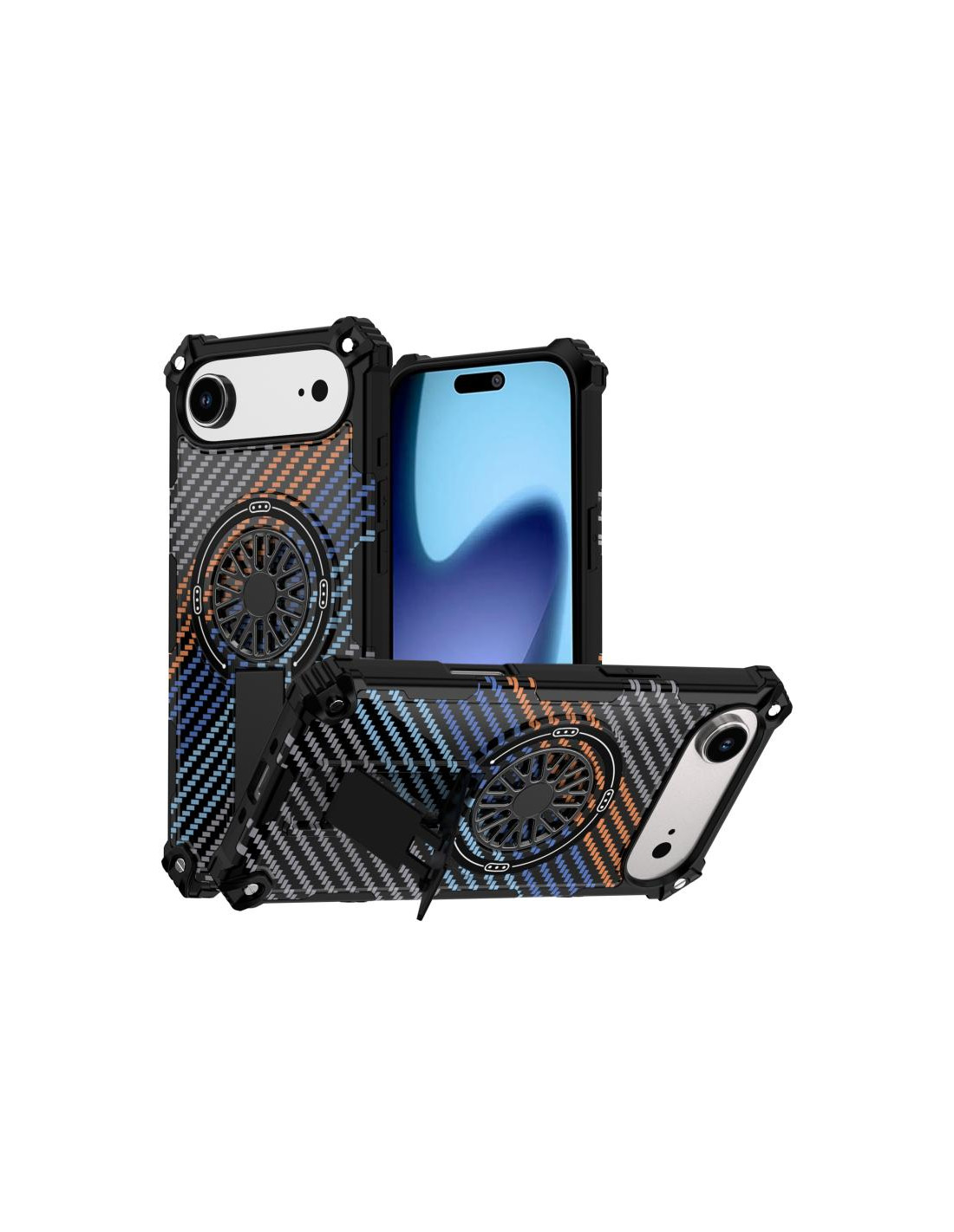 Cover iPhone Air con design mimetico in fibra di carbonio, kickstand rotante e compatibilità MagSafe per una protezione stilosa.