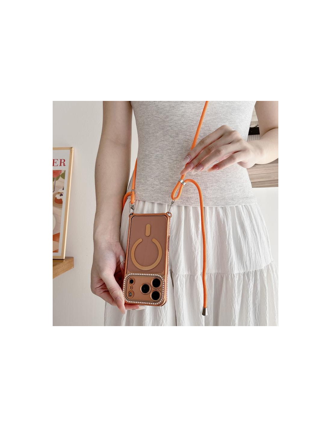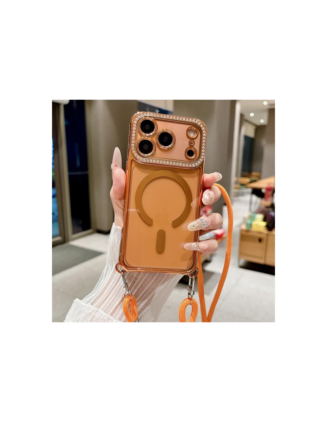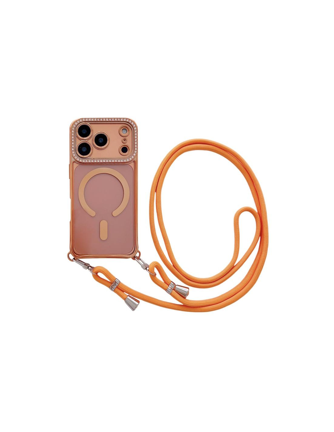 Cover iPhone 17 Pro in acrilico electroplato con strass e cordino. Design trasparente che protegge il tuo telefono con eleganza.