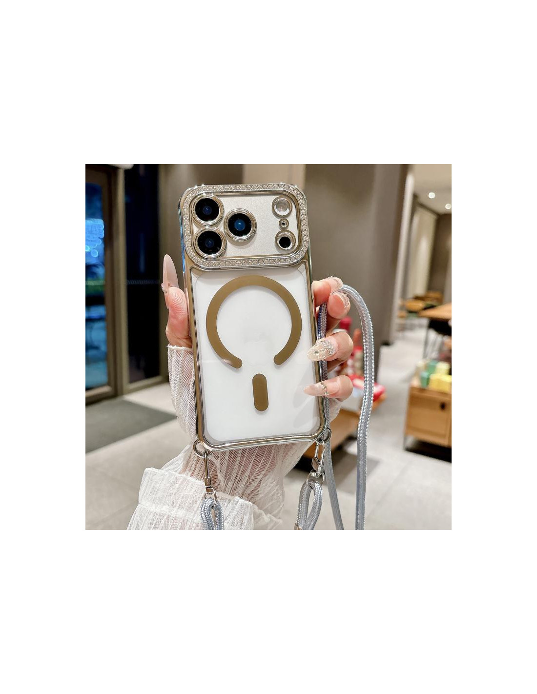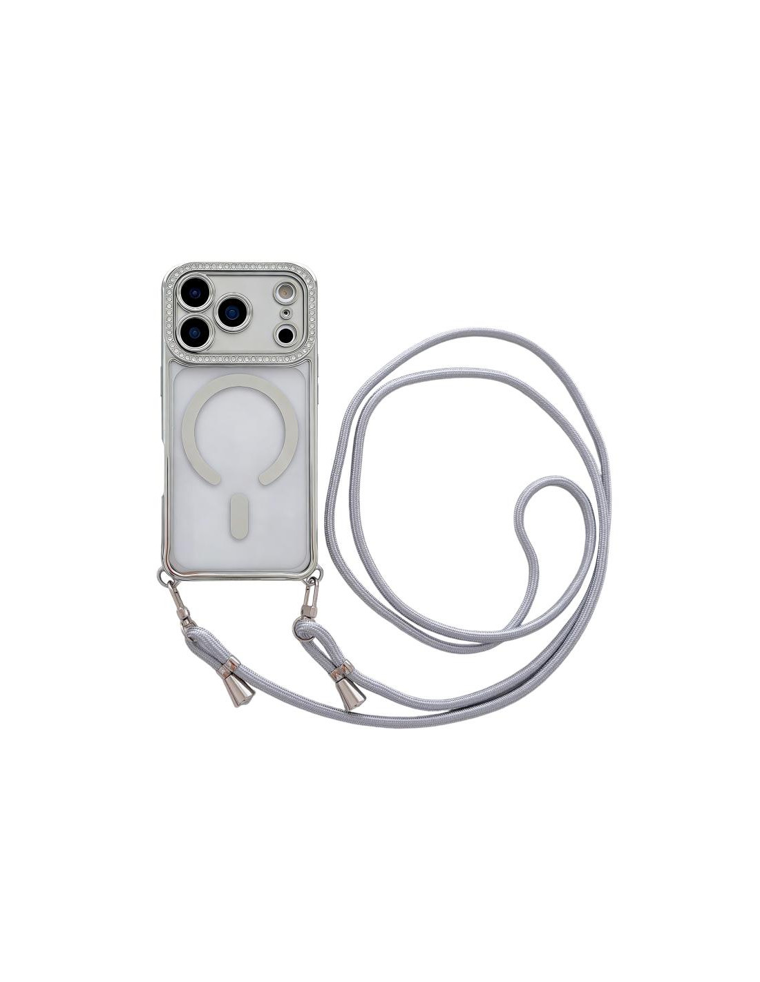 Cover iPhone 17 Pro in acrilico electroplato con strass e cordino. Design trasparente che protegge il tuo telefono con eleganza.