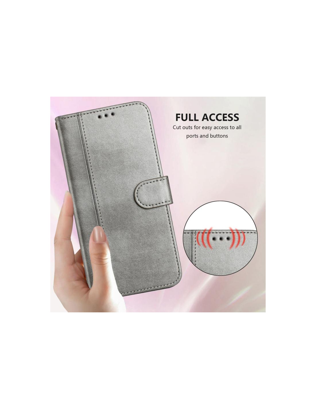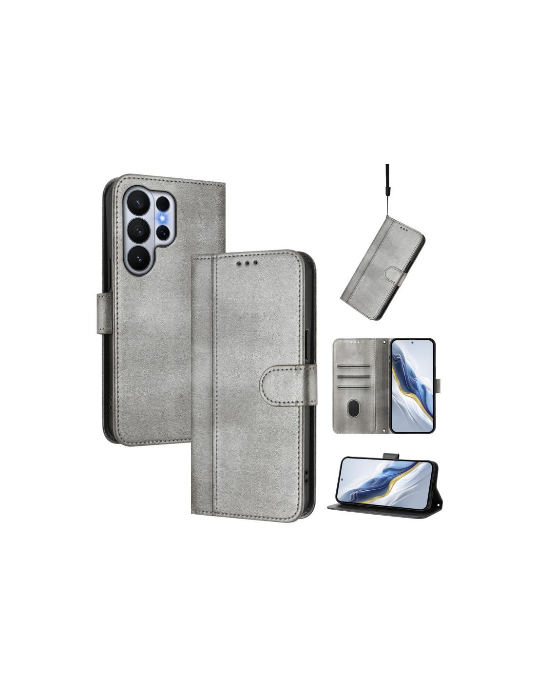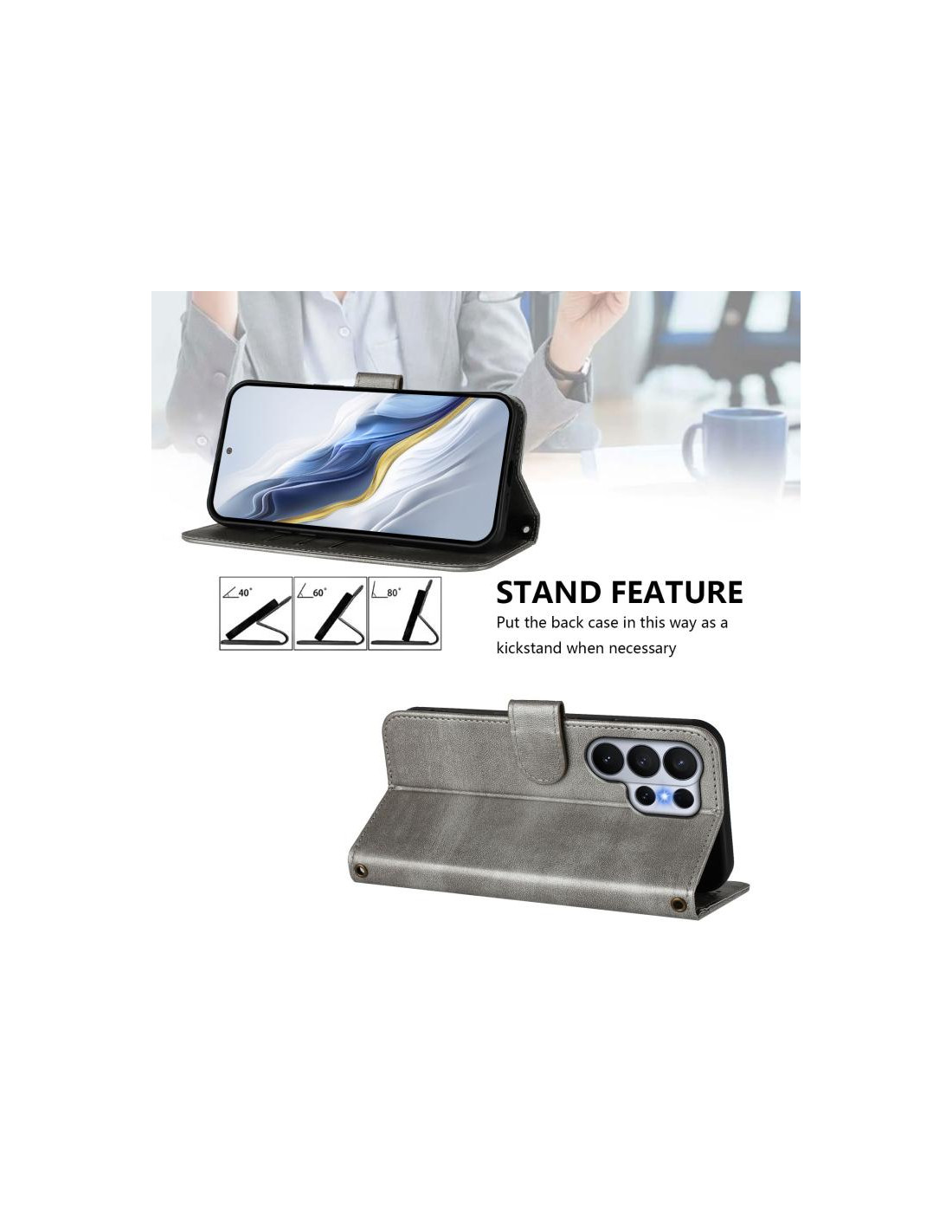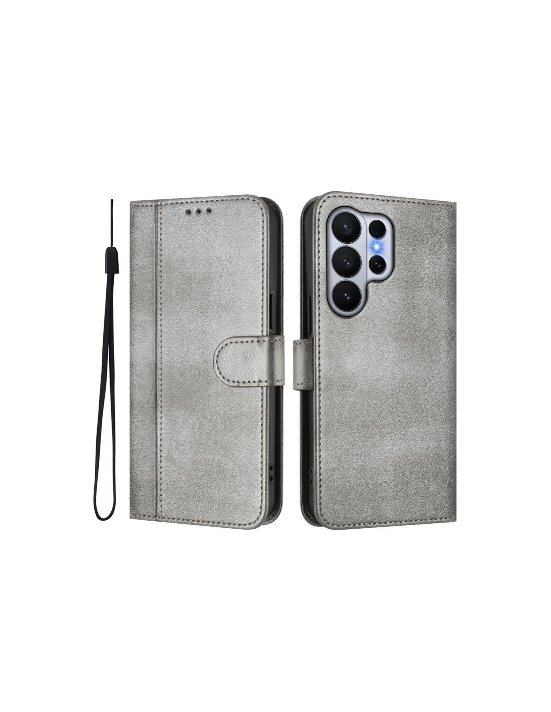 Cover in pelle PU per Galaxy S26 Ultra con design splicing a righe. Protezione elegante e retrò in grigio.