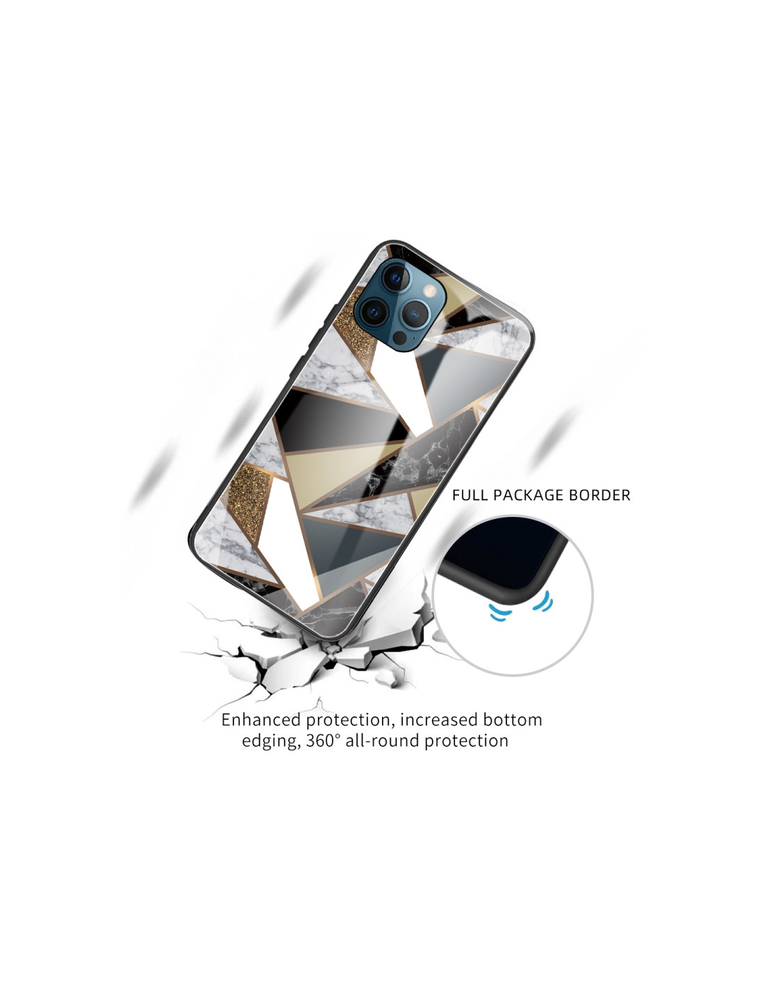 Proteggi il tuo iPhone 13 Pro Max con stile grazie a questa straordinaria cover in vetro con design marmo astratto e rombi dorati. Il materiale in vetro temperato garantisce una protezione affidabile mantenendo un aspetto elegante e sofisticato.