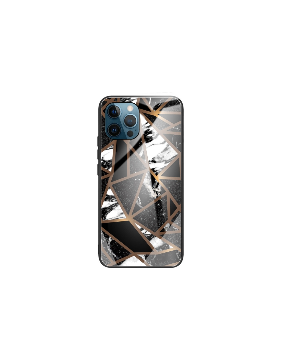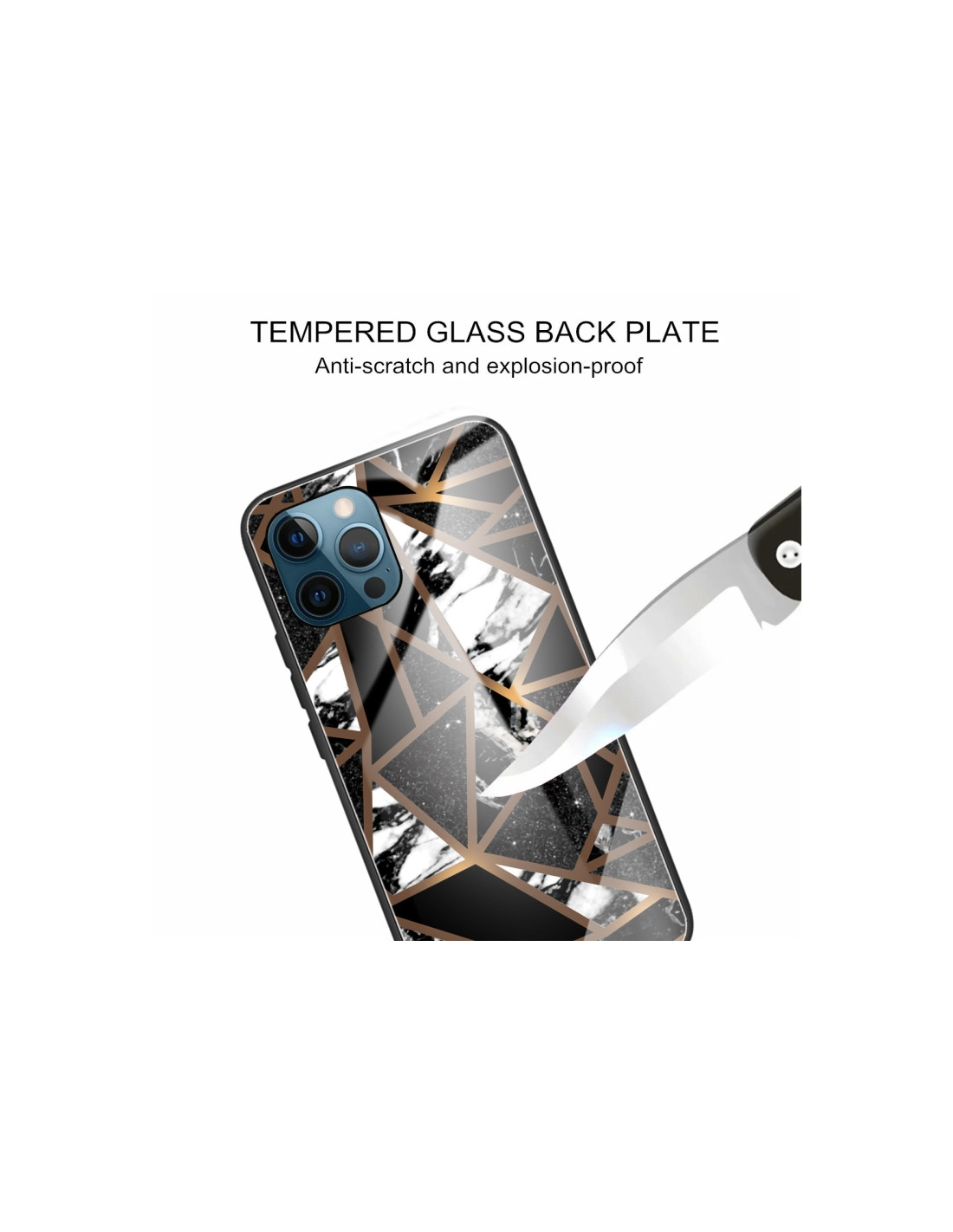 Cover protettiva in vetro per iPhone 13 Pro Max con design marmo astratto e pattern rombo nero elegante.