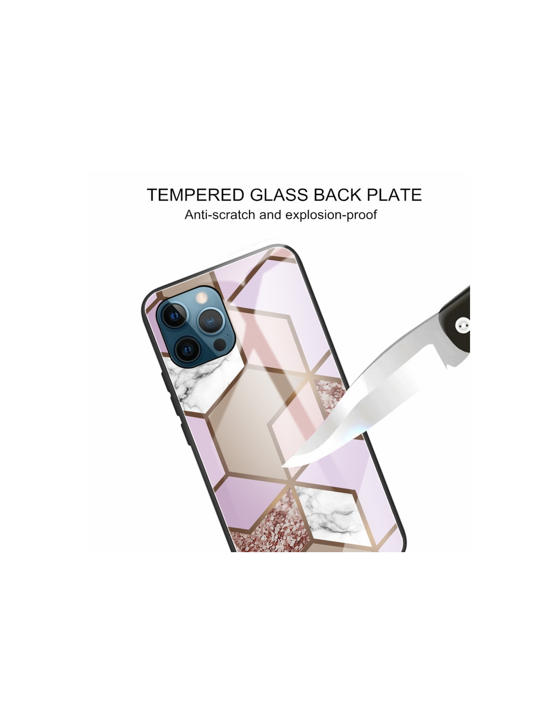 La cover iPhone 13 Pro in vetro protettivo combina stile e sicurezza per il tuo smartphone. Con un esclusivo design a motivo marmo astratto con rombi in arancione e viola, offre un look sofisticato e moderno.