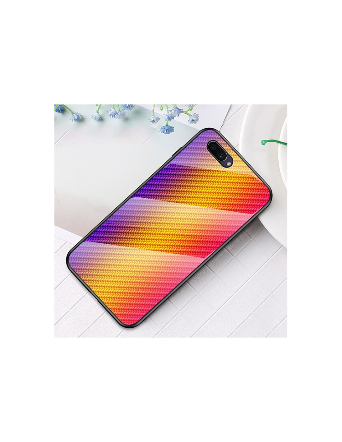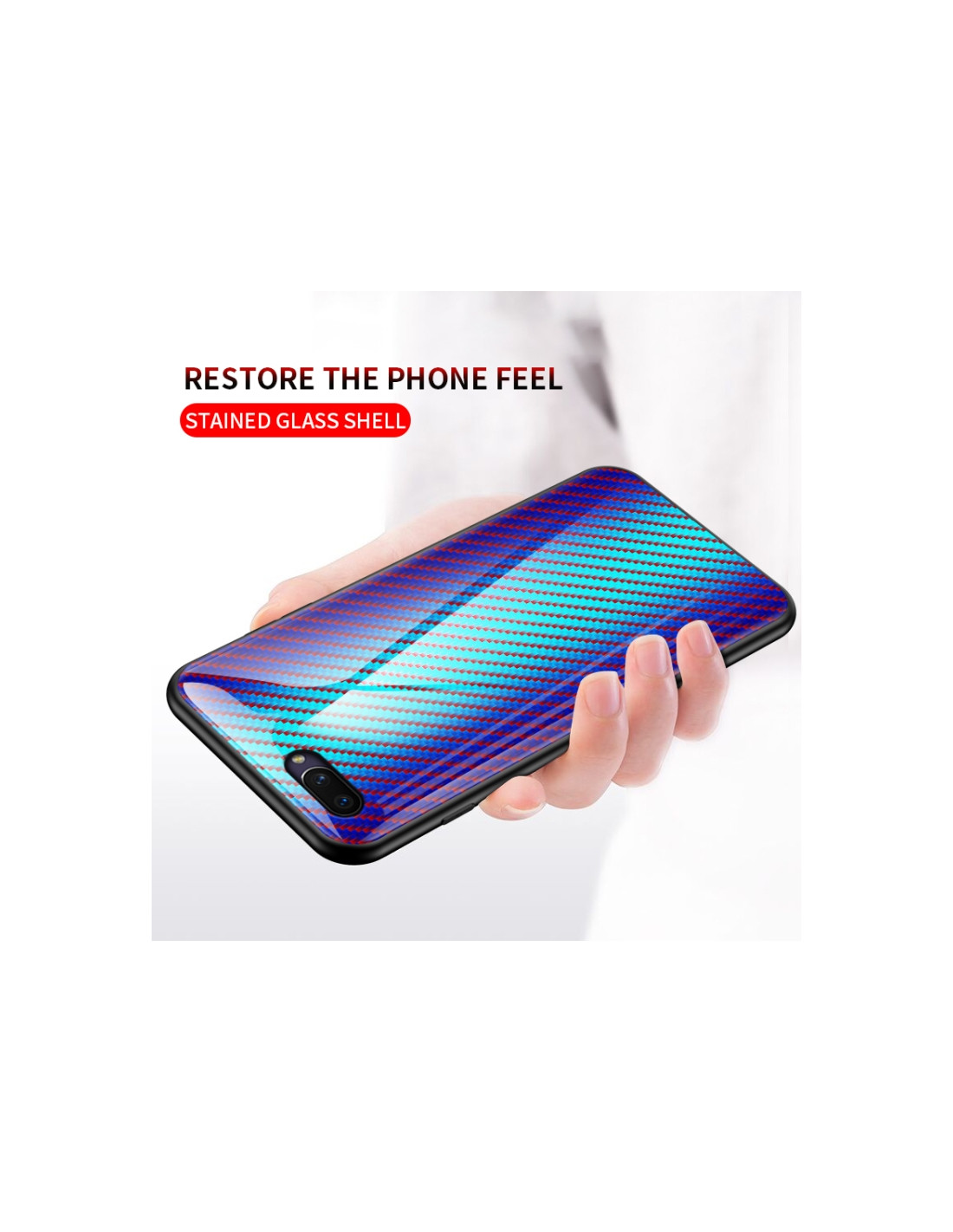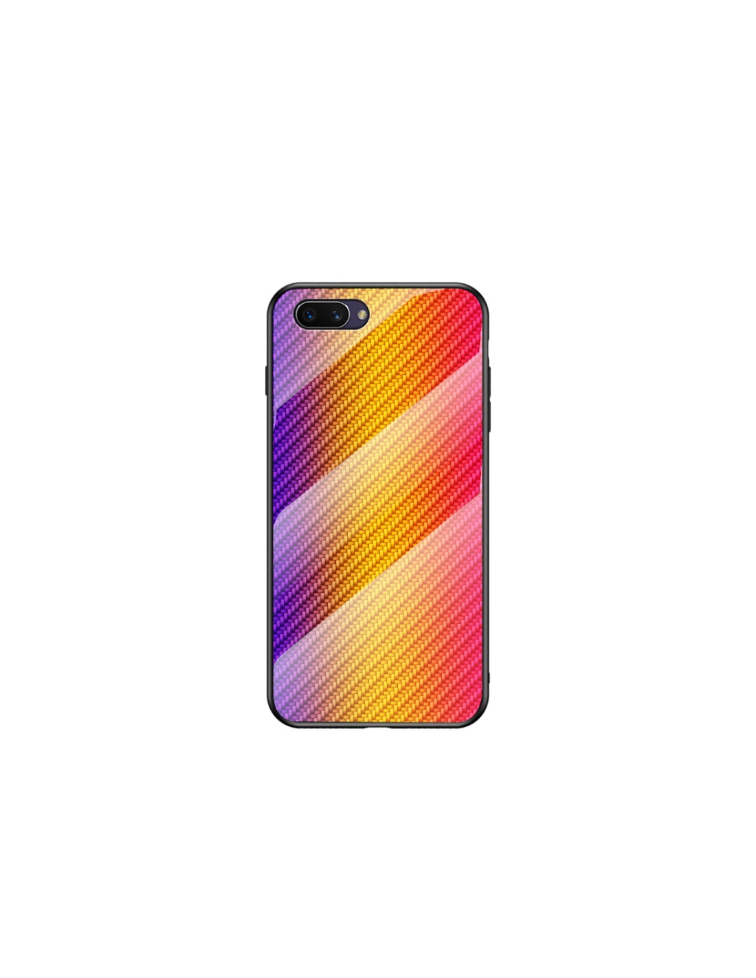 Cover OPPO A5 in TPU con bordo in fibra di carbonio sfumata e retro in vetro temperato. Protezione completa.