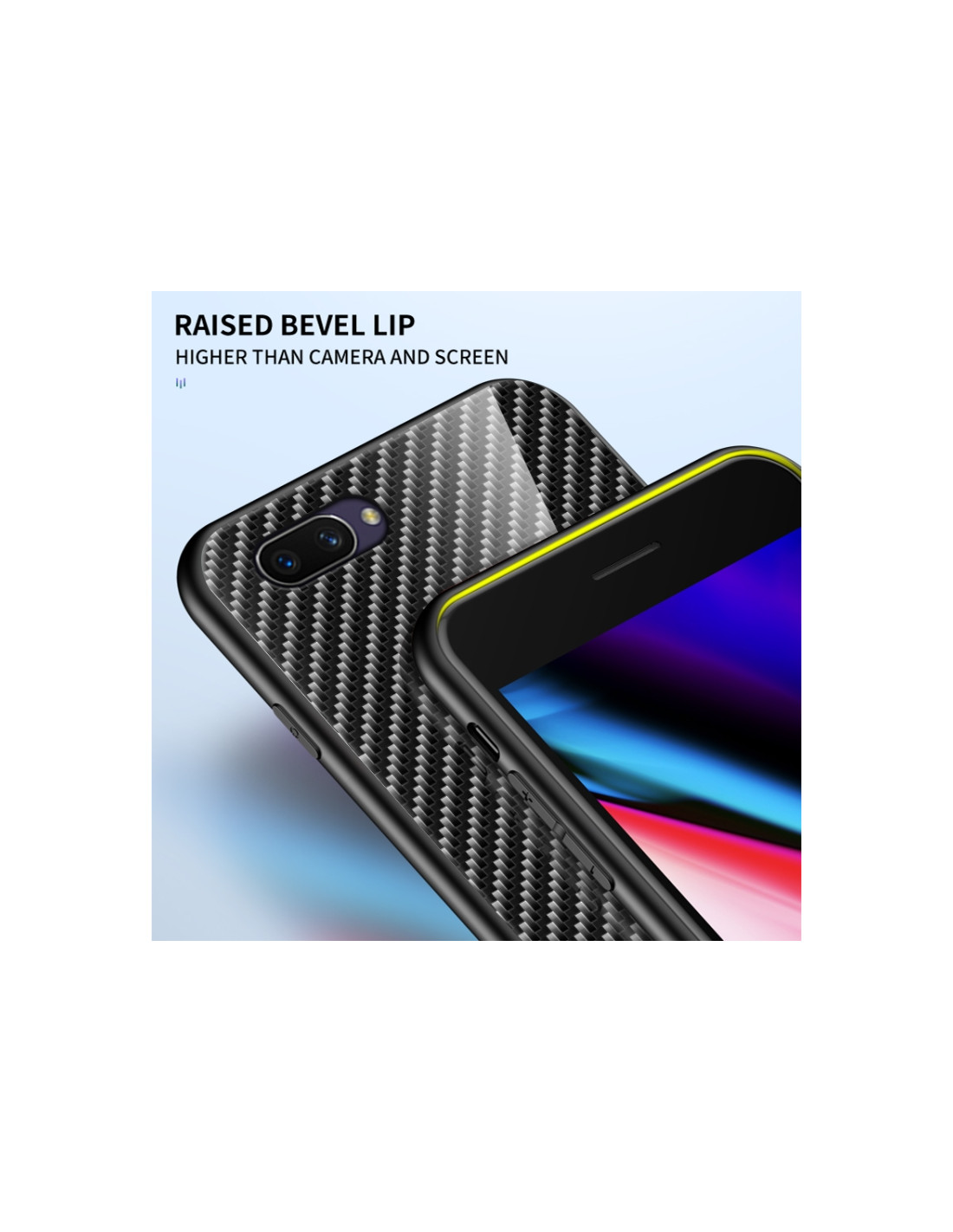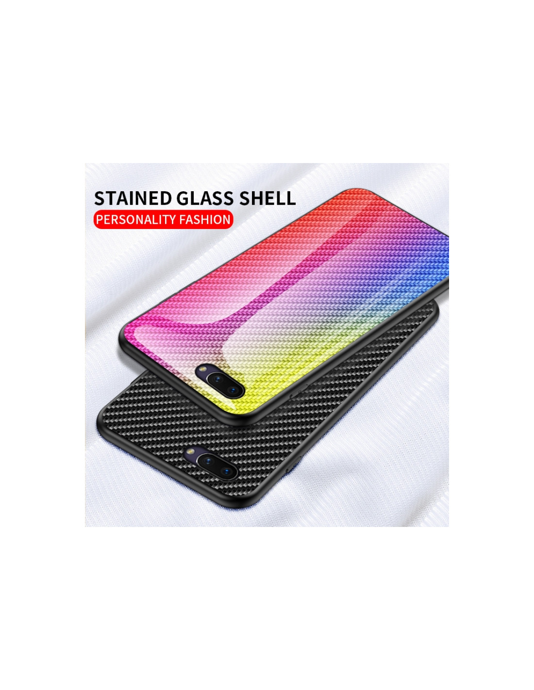 Cover OPPO A5 in TPU con bordo in fibra di carbonio sfumata e retro in vetro temperato. Protezione completa.