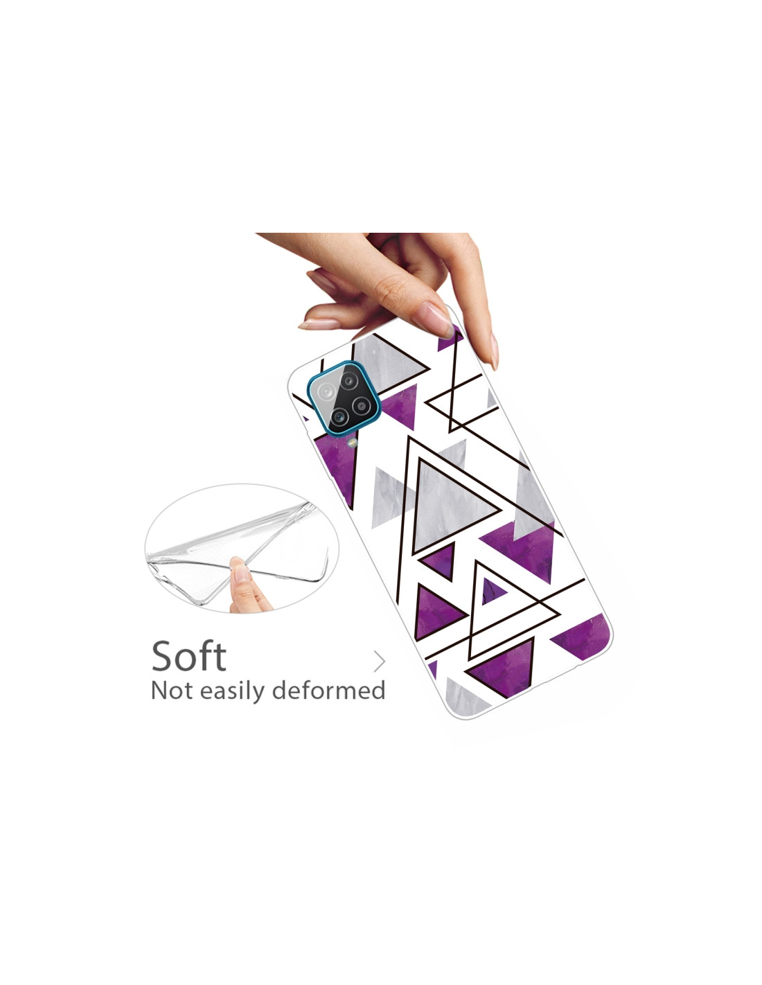 La cover Galaxy A12 in TPU con pattern marmo triangolare combina protezione duratura e design elegante. Realizzata in materiale TPU flessibile e resistente, offre una protezione efficace contro urti e cadute quotidiane, mantenendo lo smartphone sottile e maneggevole.