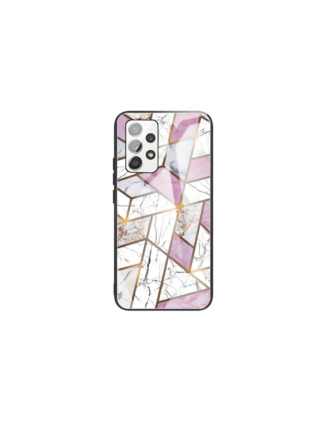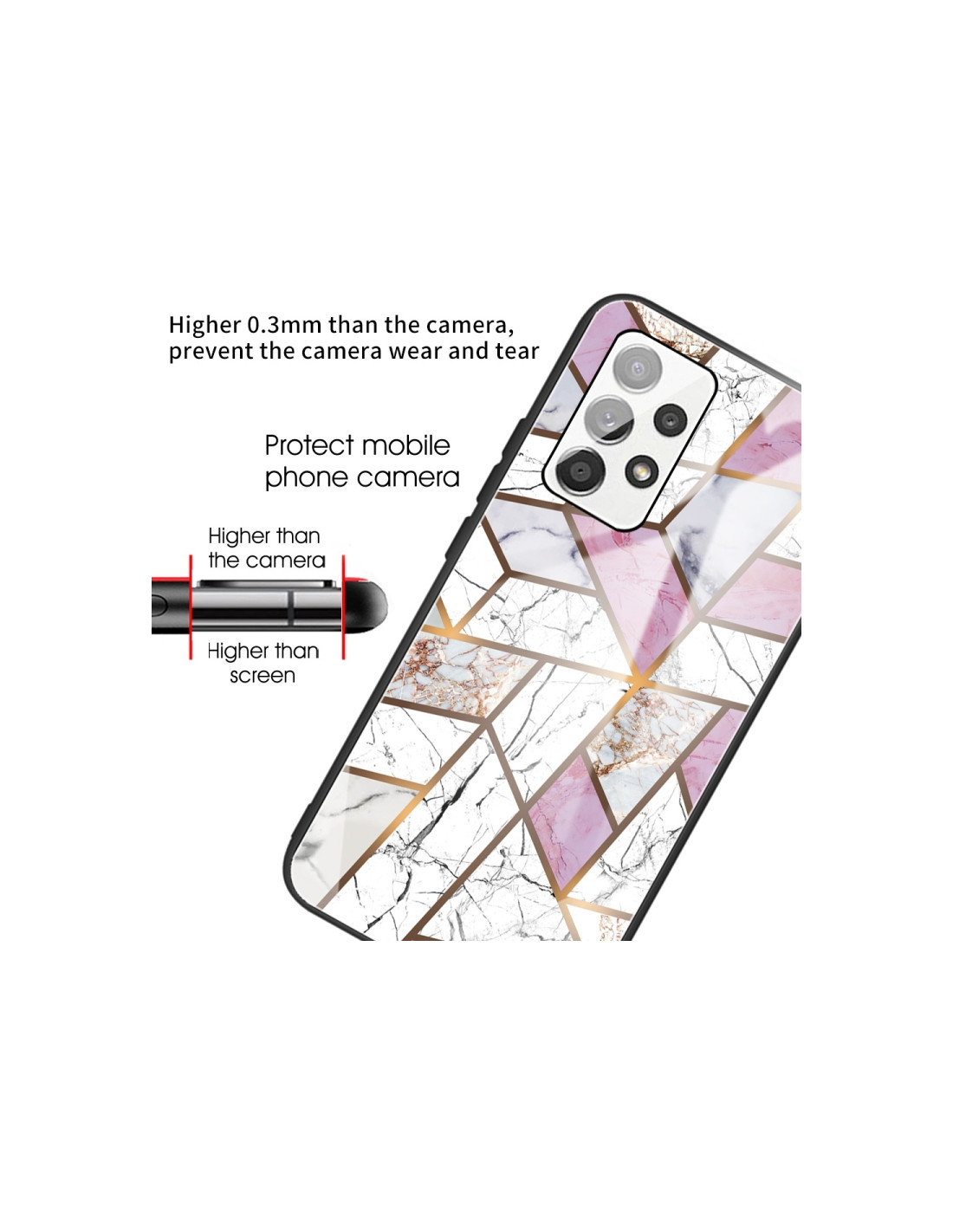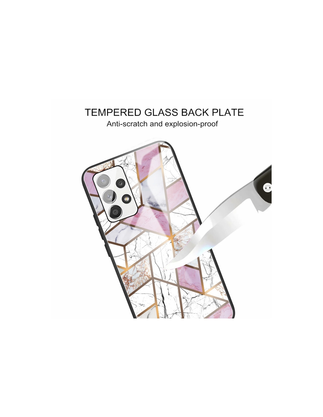 Cover in vetro per Galaxy A32 4G con design marmo astratto e rombi bianco viola. Protezione elegante e resistente.