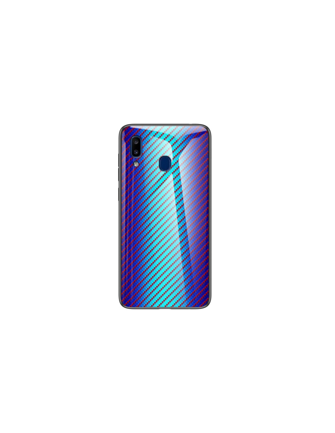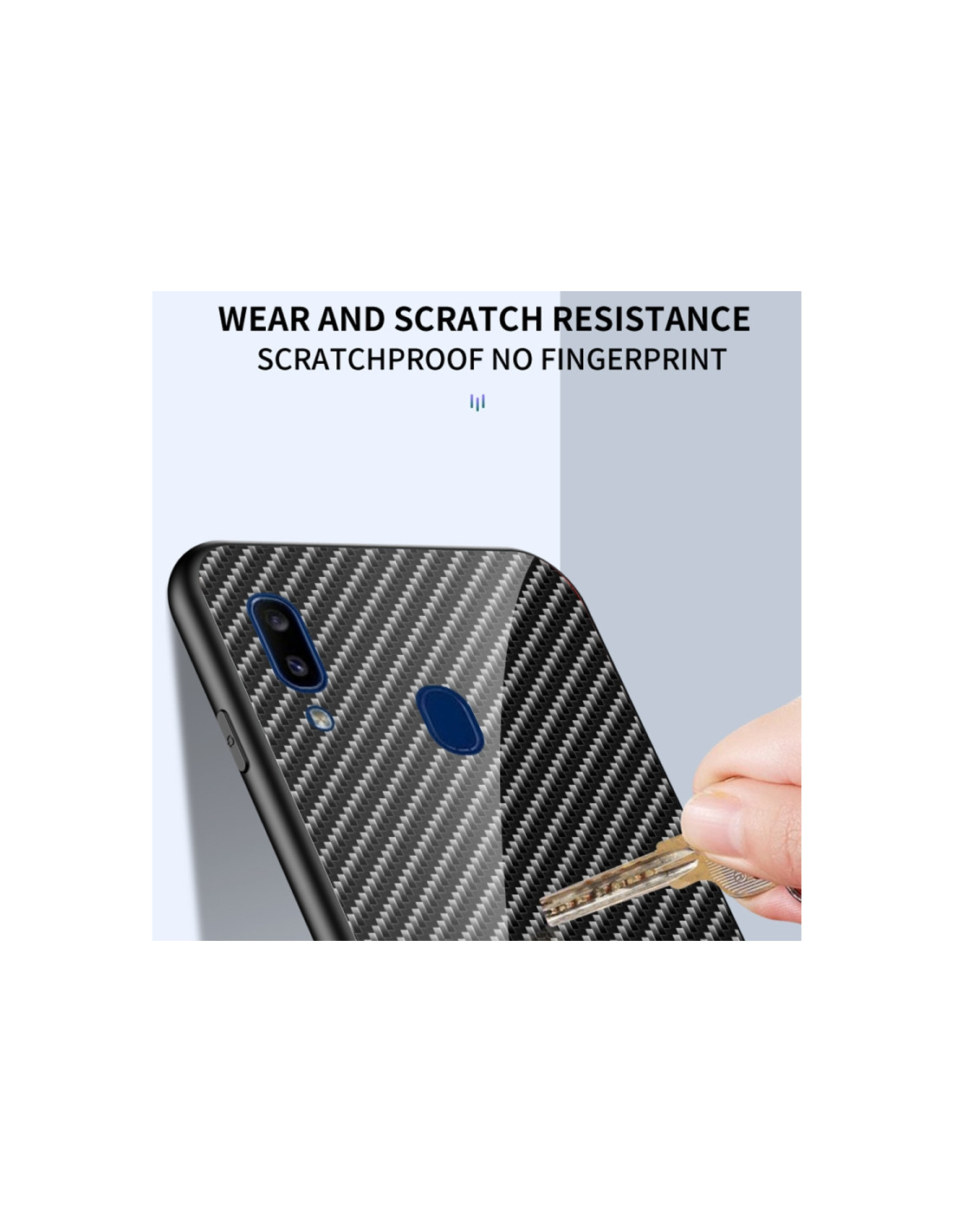 Cover Galaxy A20e in TPU con bordo in fibra di carbonio e vetro temperato posteriore. Protezione elegante e resistente.