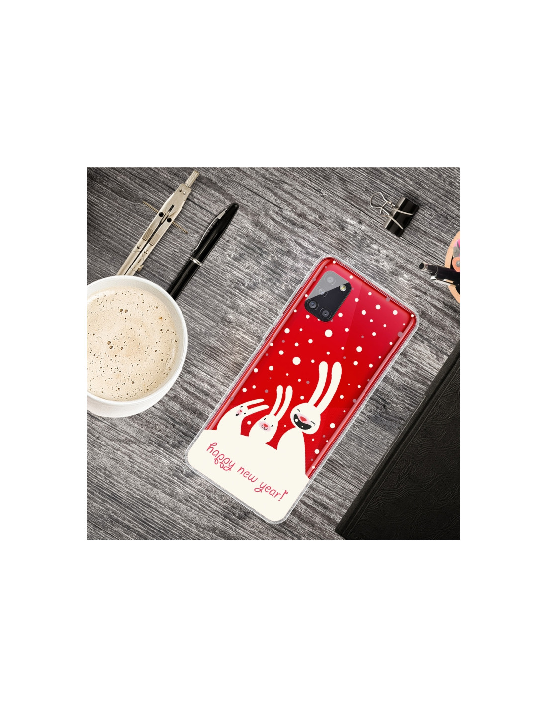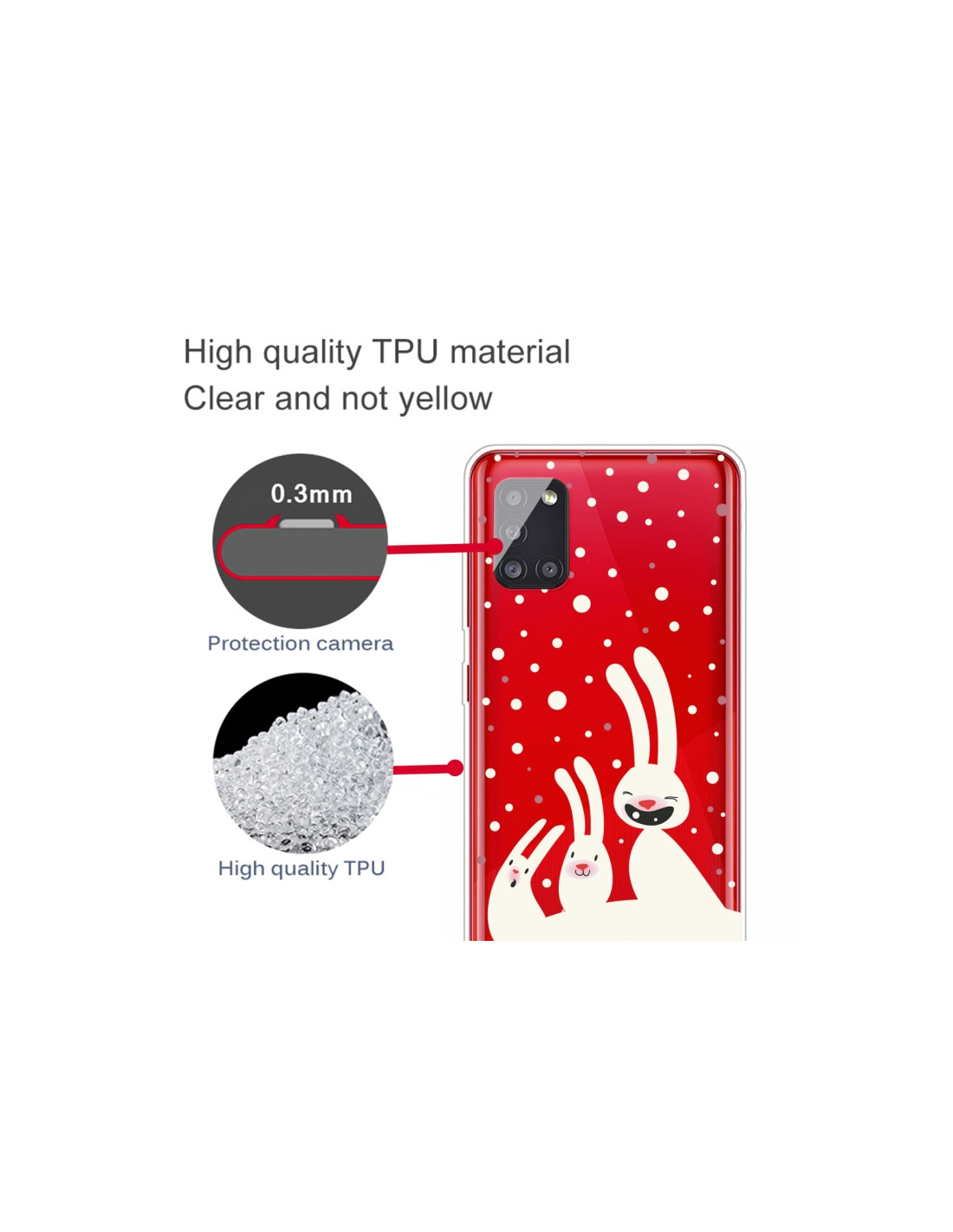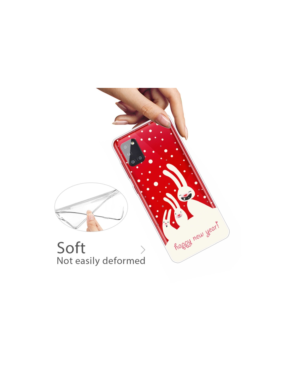 La cover Galaxy A51 5G in TPU trasparente con fantasia Three Bianco Rabbits è la soluzione ideale per chi vuole proteggere il telefono senza nascondere il suo design originale. Realizzata in materiale TPU di qualità, offre una protezione affidabile dagli urti quotidiani.