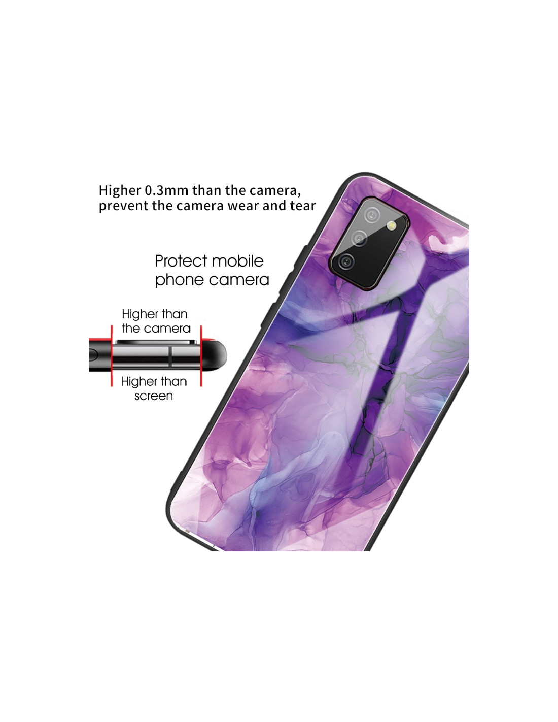 Cover Galaxy A02s in vetro protettivo con fantasia marmo astratto viola. Protezione elegante e resistente.