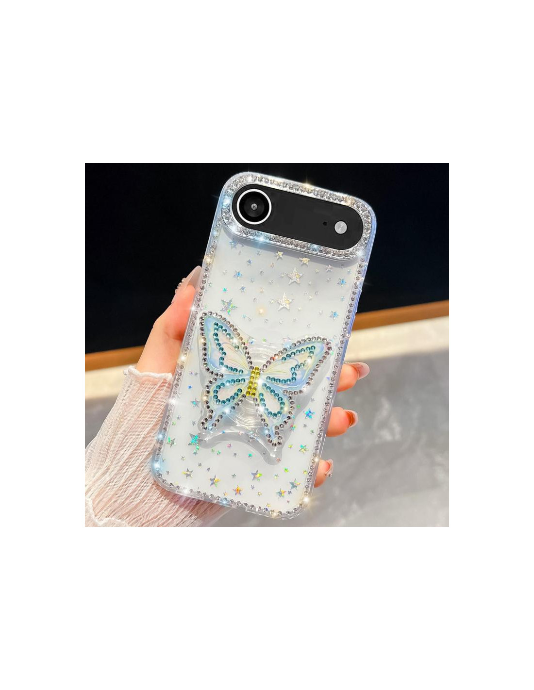 Cover trasparente per iPhone Air con design farfalla glitterata e stelle. Protezione elegante che valorizza il tuo telefono.