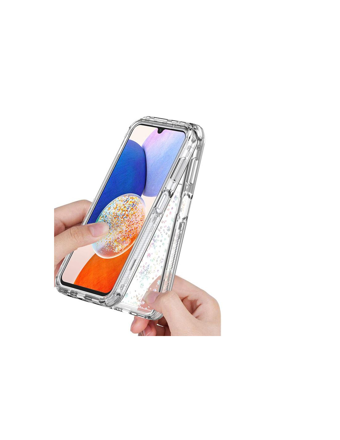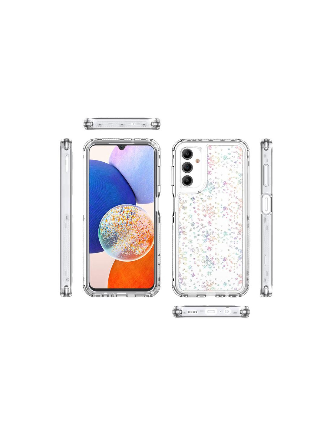 Cover trasparente in acrilico per Galaxy A14 5G con design laser fiocco di neve. Protegge mantenendo visibile il telefono.