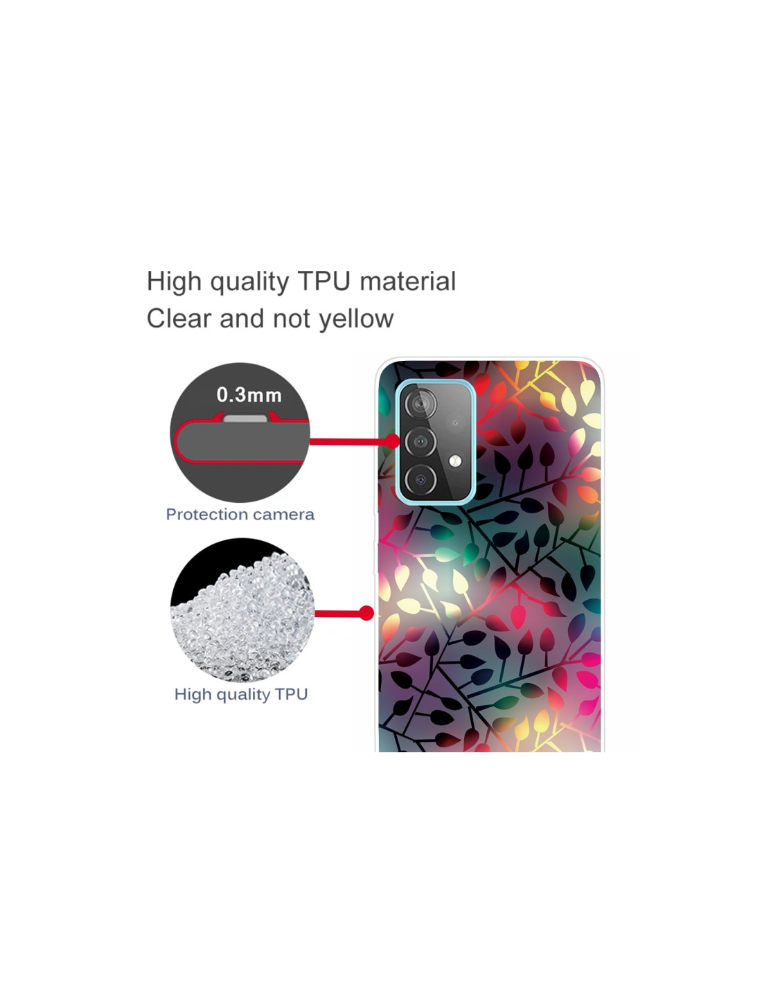 La cover Galaxy A32 5G con design Rami Fluorescenti combina protezione e stile in un unico prodotto. Realizzata in TPU shockproof, garantisce una difesa completa dagli urti mantenendo la trasparenza del dispositivo originale.