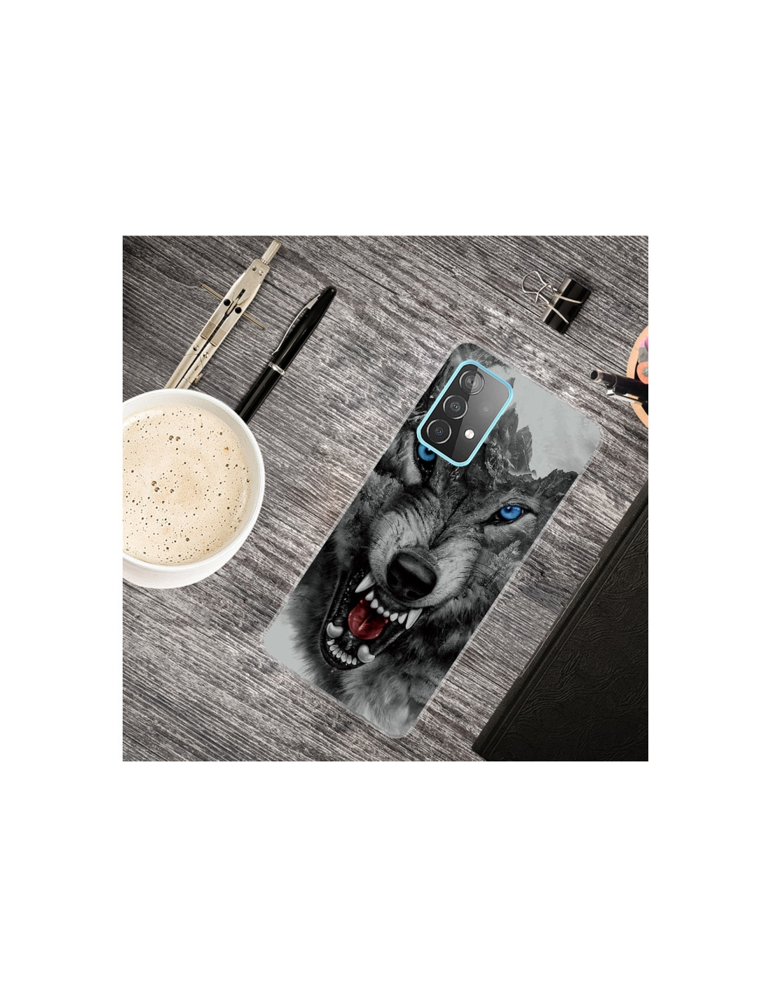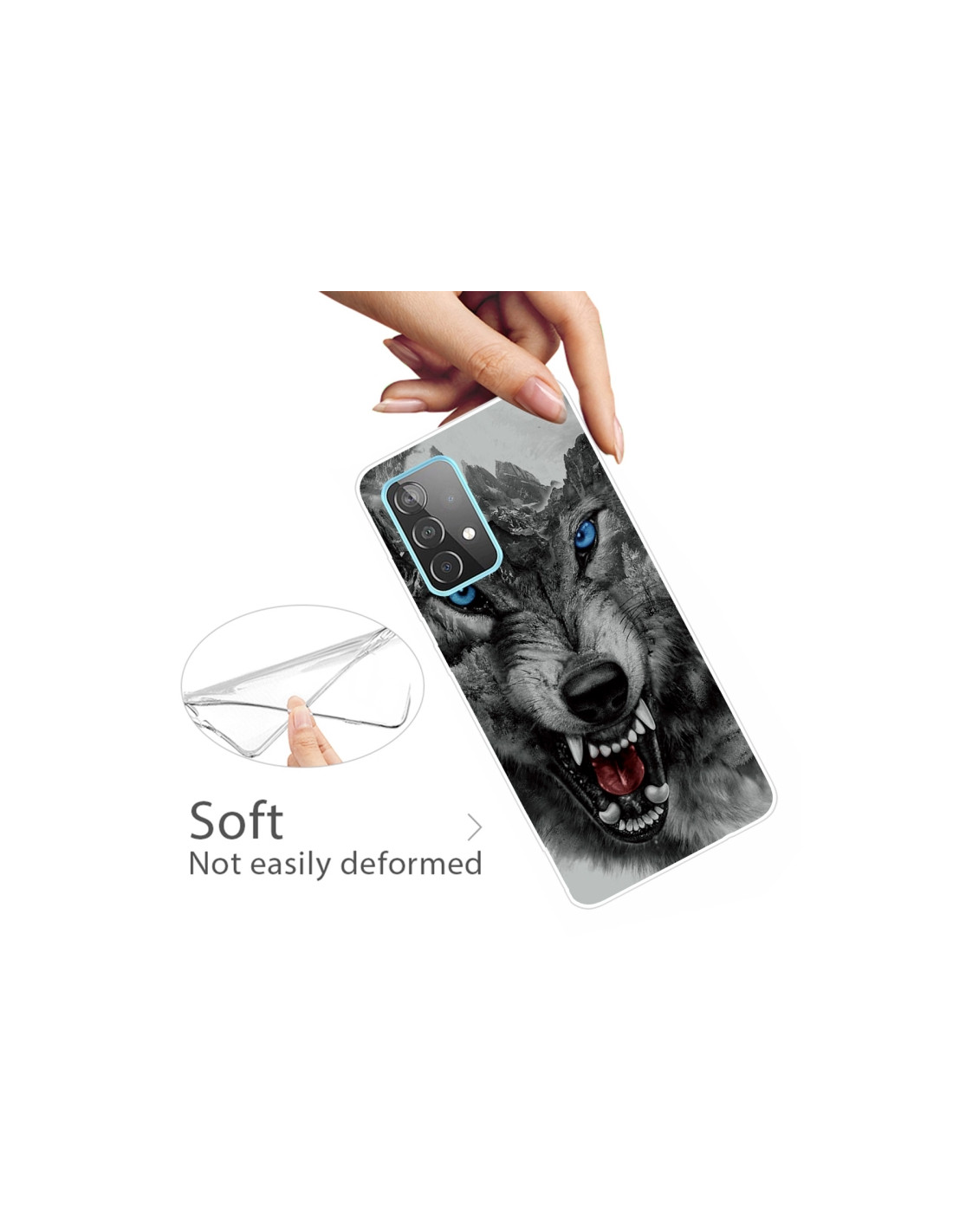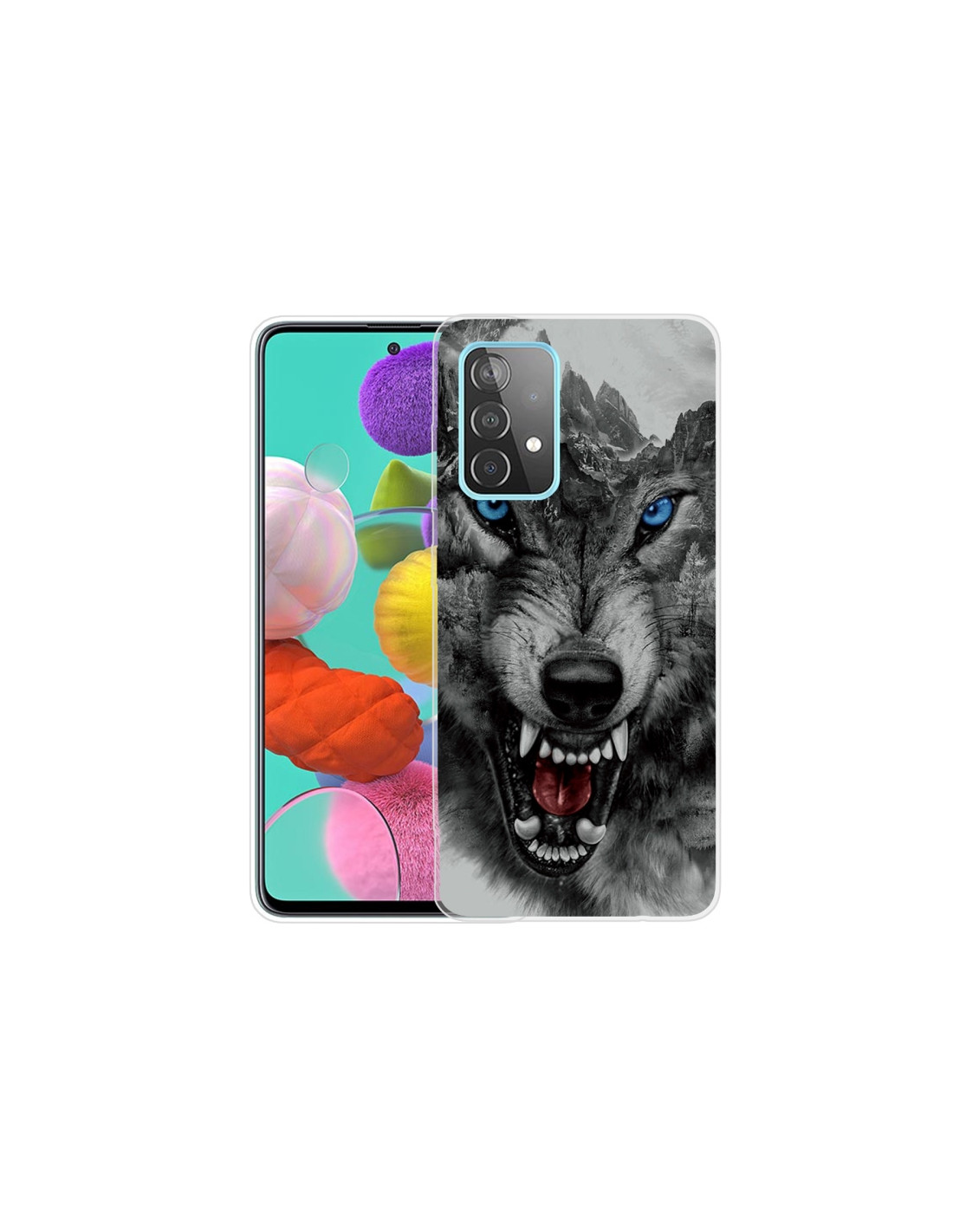 Cover trasparente TPU per Galaxy A72 con design lupo di montagna. Protezione antiurto e design visibile.