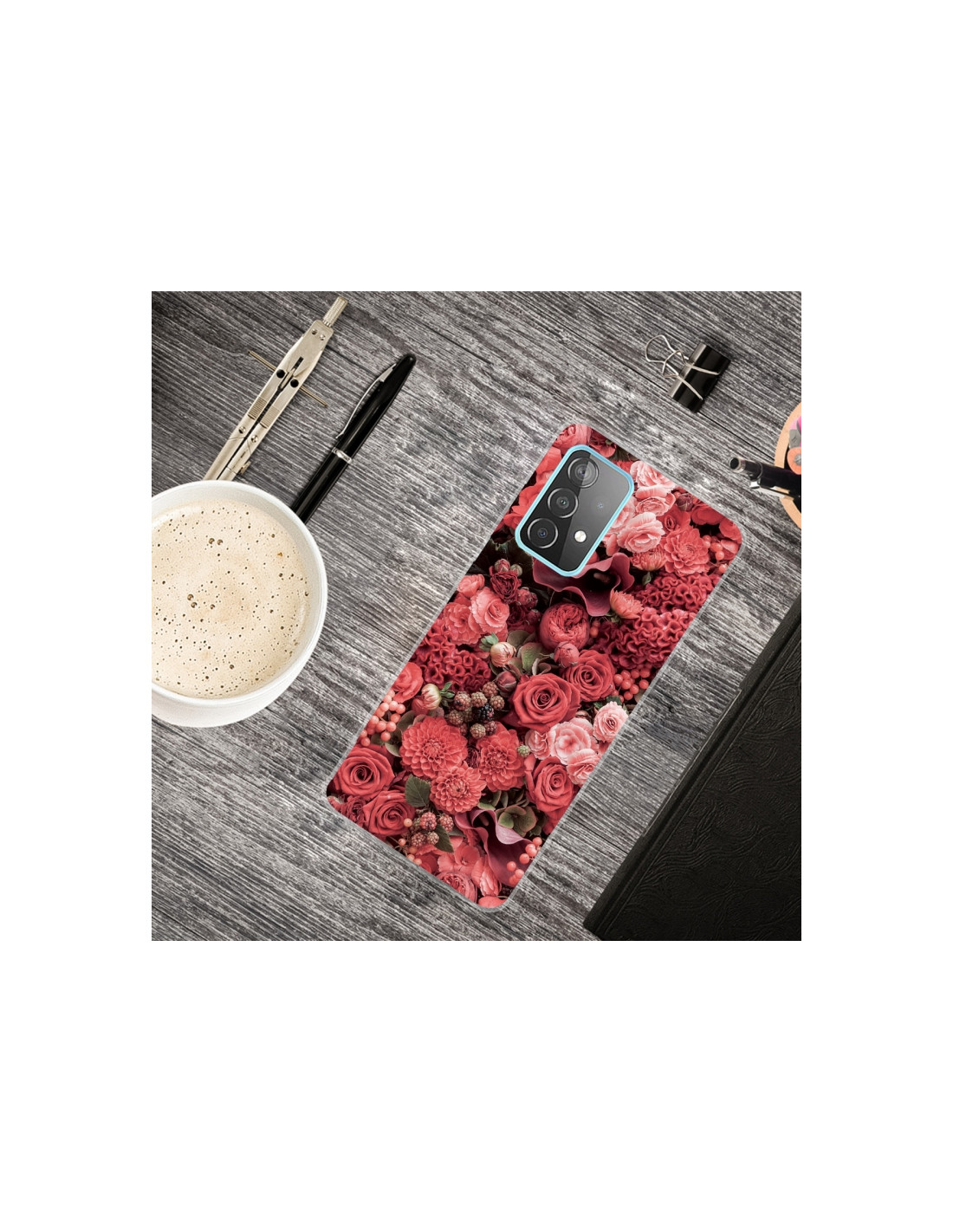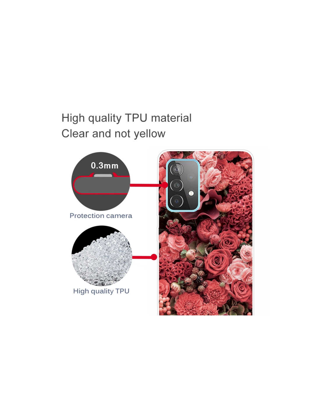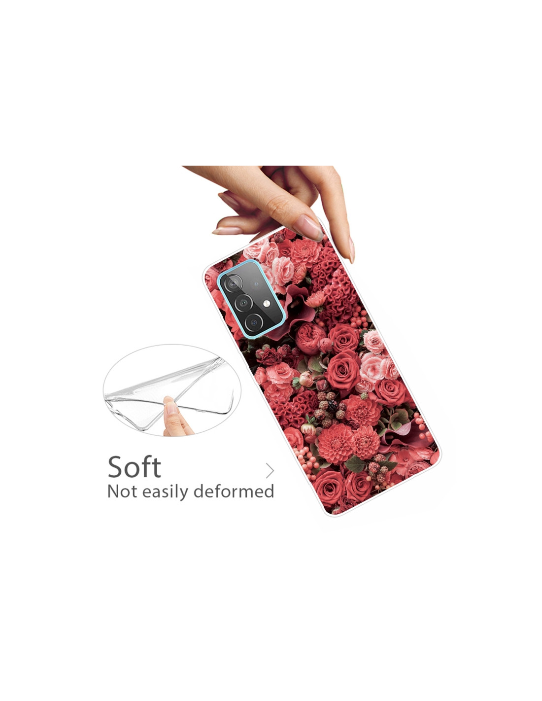 La cover trasparente per Galaxy A72 combina protezione e eleganza. Realizzata in TPU resistente agli urti, mantiene il design originale del tuo smartphone visibile grazie alla trasparenza, valorizzando la bellezza del dispositivo. Il pattern con rose rosse crea un accento decorativo raffinato.