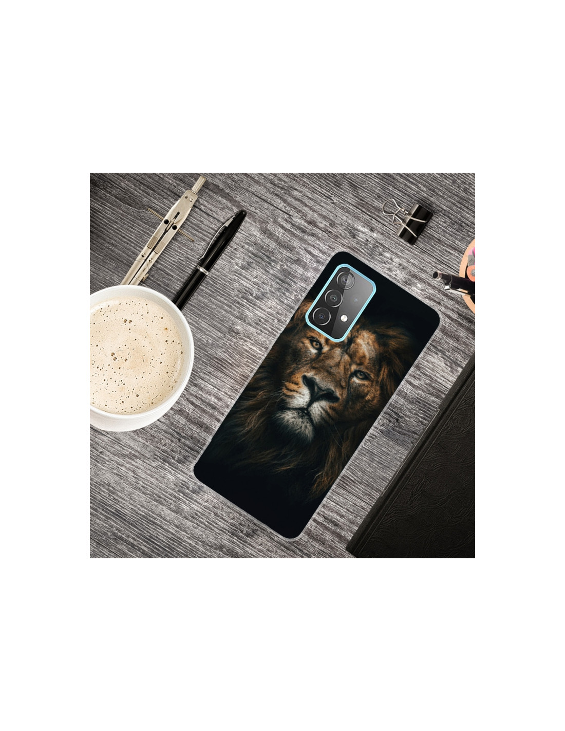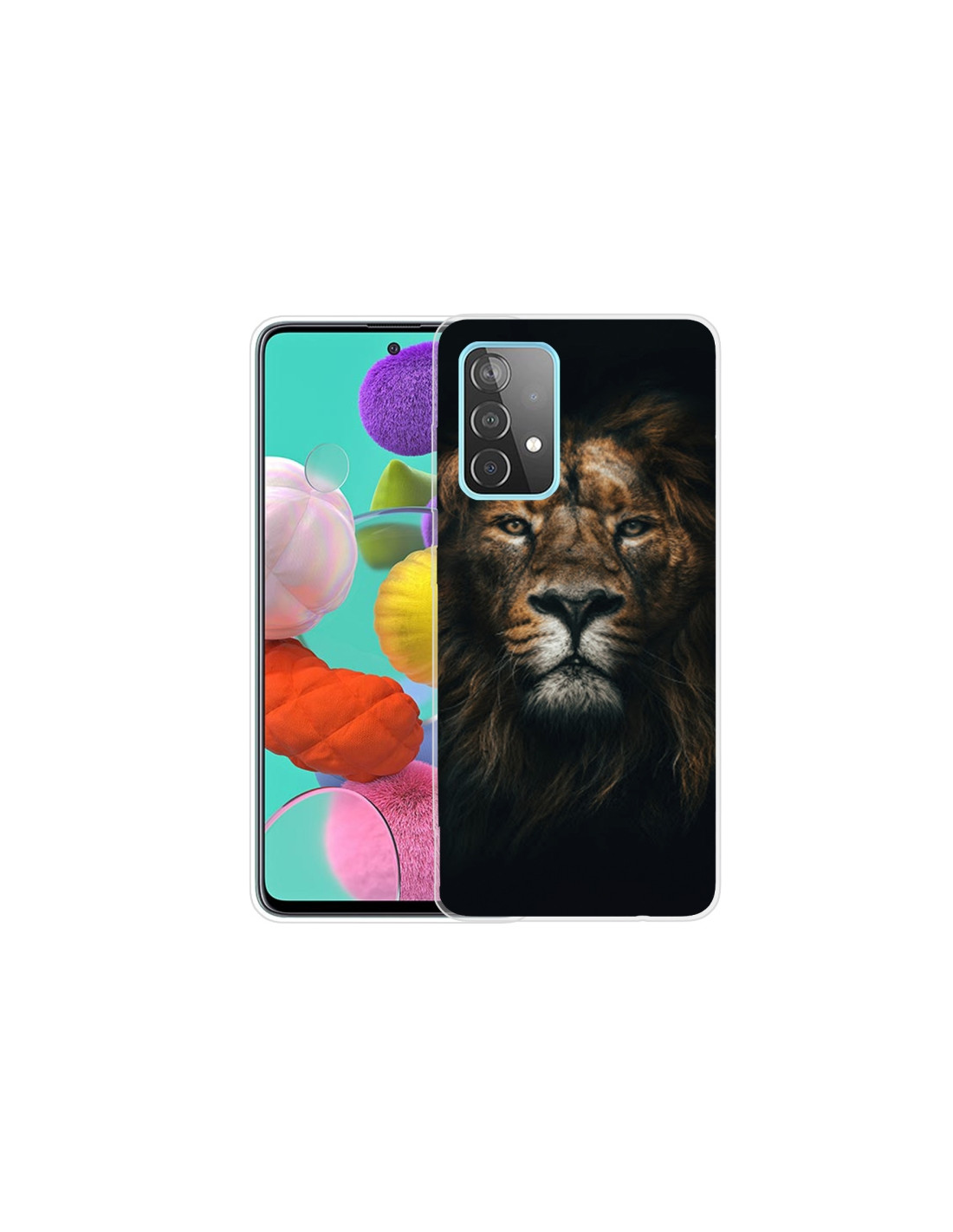 Cover Galaxy A72 in TPU trasparente antiurto con design Leone Giallo. Protezione robusta e stile unico.