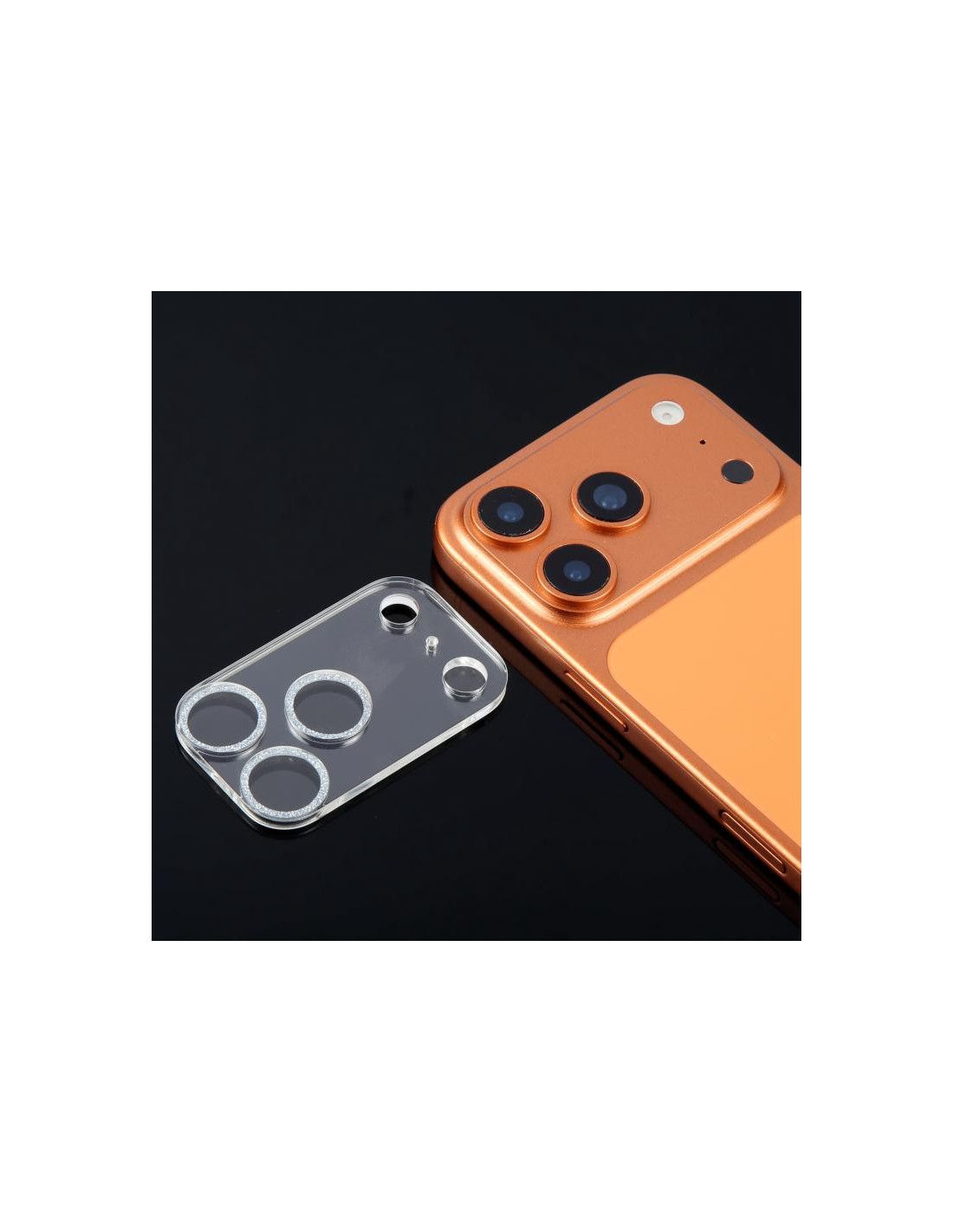 Pellicola in vetro temperato per fotocamera iPhone 17 Pro con design glitterato argento. Protezione duratura e elegante.