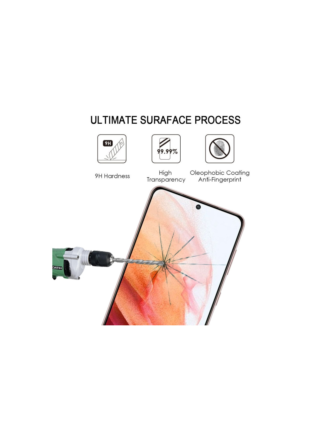 Il vetro temperato per Galaxy S21 5G offre una protezione completa dello schermo con tecnologia a bordi curvi 3D. Realizzato in vetro temperato di alta qualità, garantisce una durezza di 9H per resistere a graffi e urti accidentali.