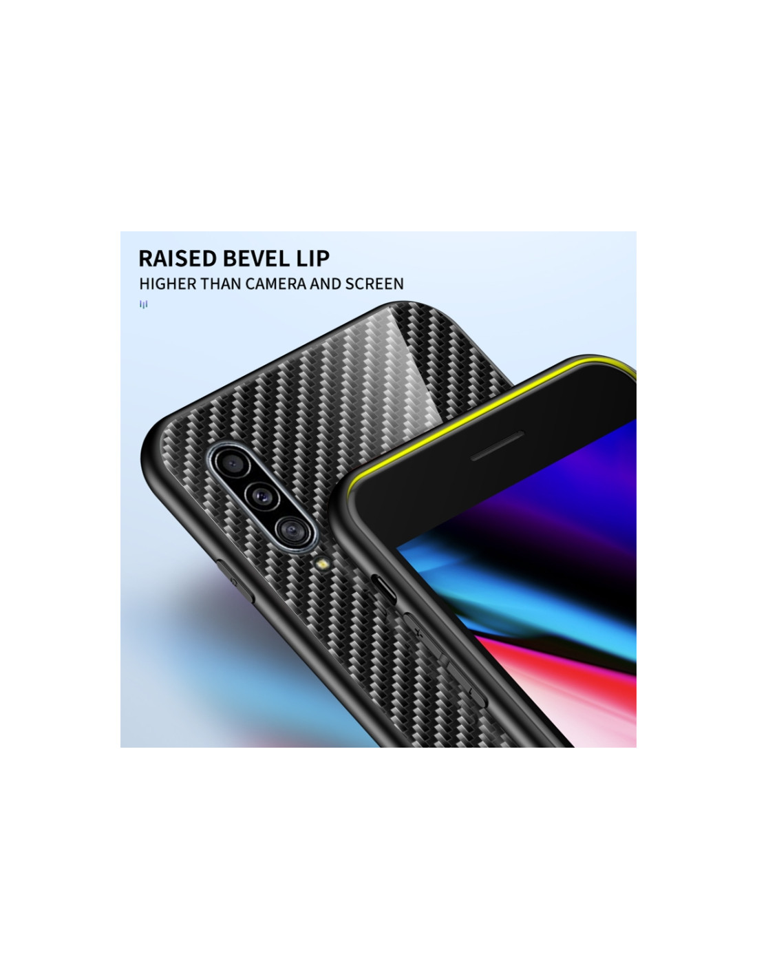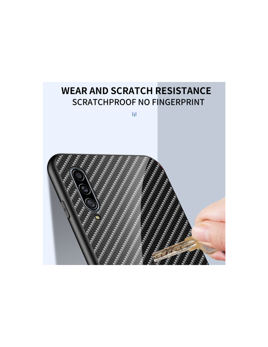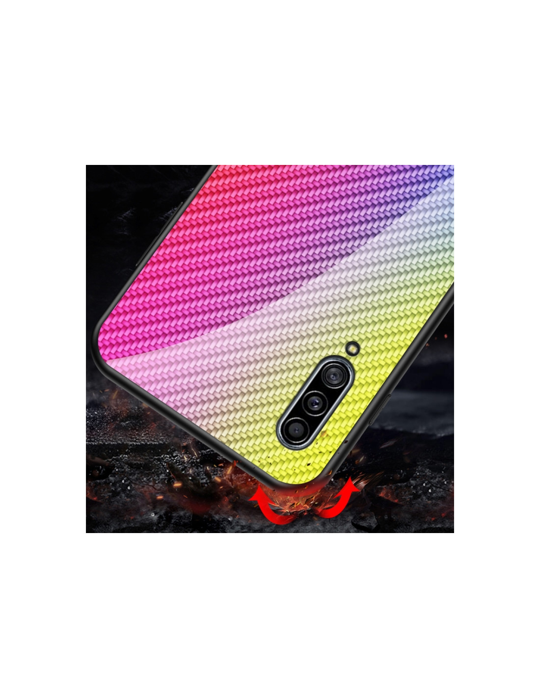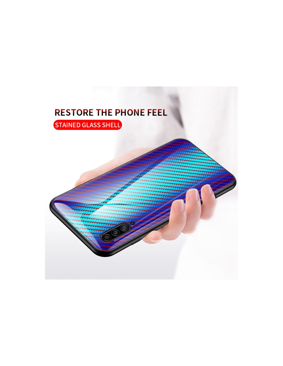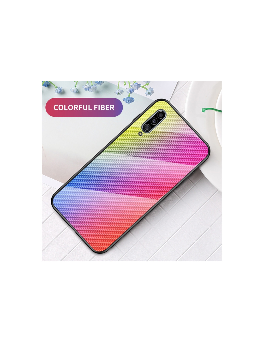 Cover ibrida per Galaxy A50s/A30s/A50 con bordo TPU e retro in vetro temperato. Design Fibra di Carbonio Sfumata multicolore.